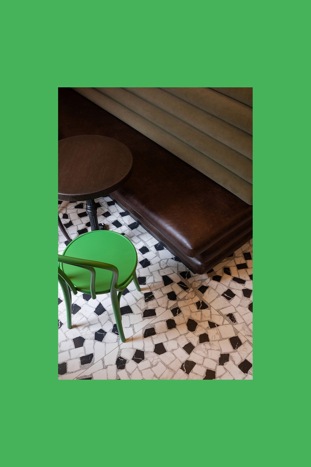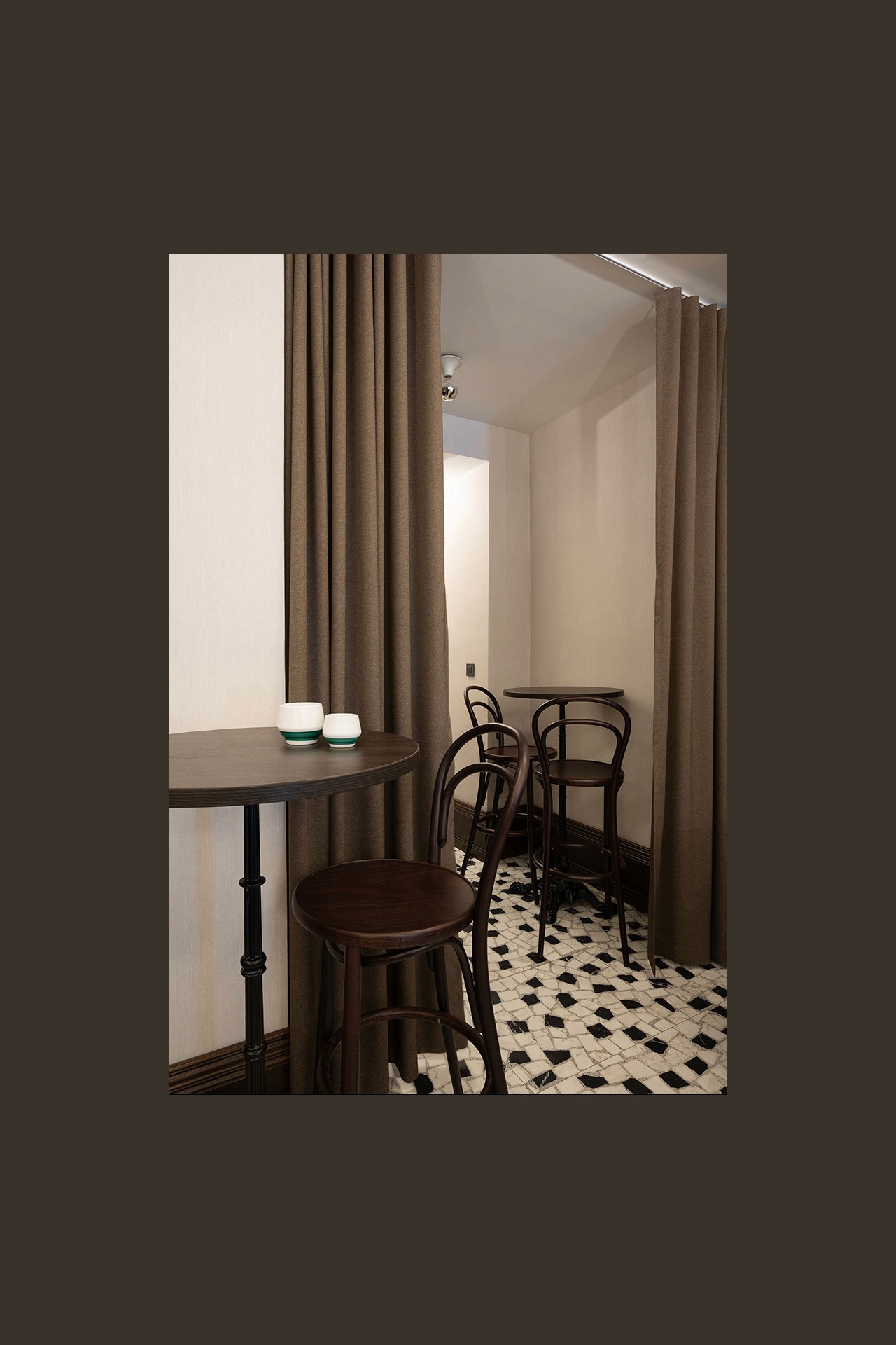 Analiza nas je vodila prema atmosferi i materijalima koji nose priču. Tragom prvih banaka stigli smo do Italije i njezine taktilnosti: terazzo paladiano na podu, kasetirani strop kao reinterpretacija krova, te zidovi obloženi tapetama i teksturama koje će s vremenom dobiti dodatnu patinu.